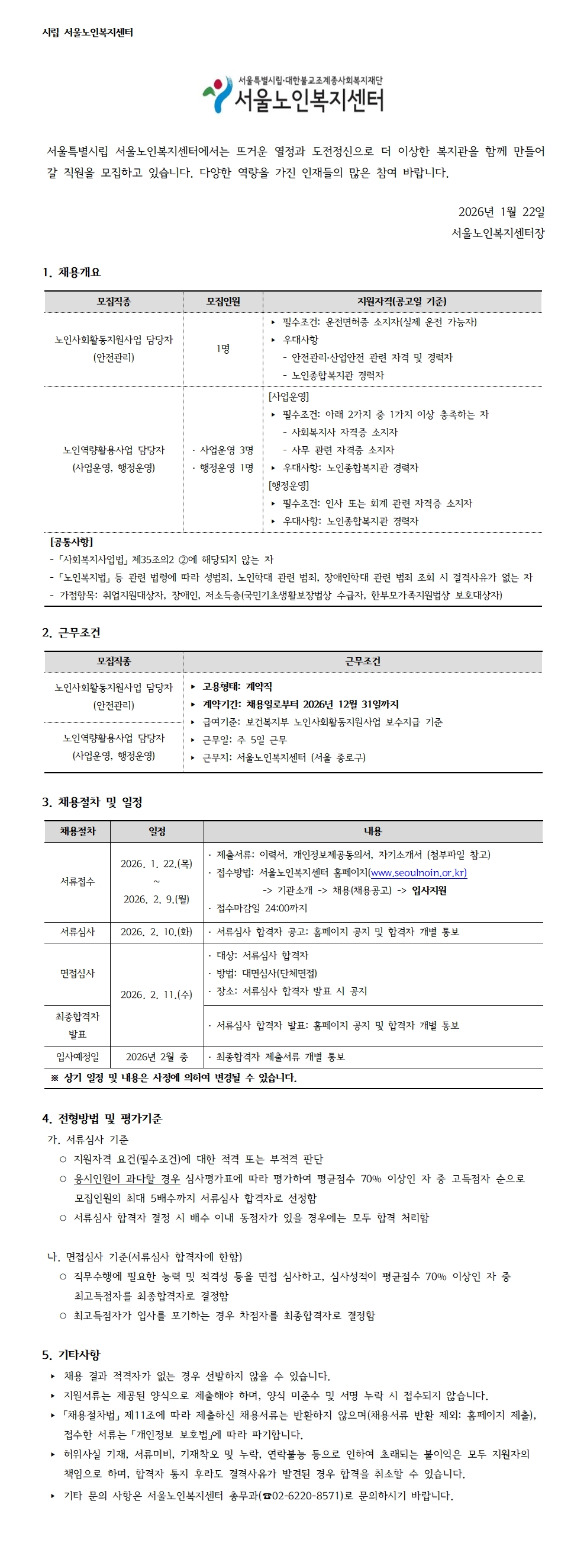 서울노인복지센터 직원 채용 공고(노인사회활동지원사업 담당자, 노인역량활용사업 담당자) ㅣ 서류접수마감