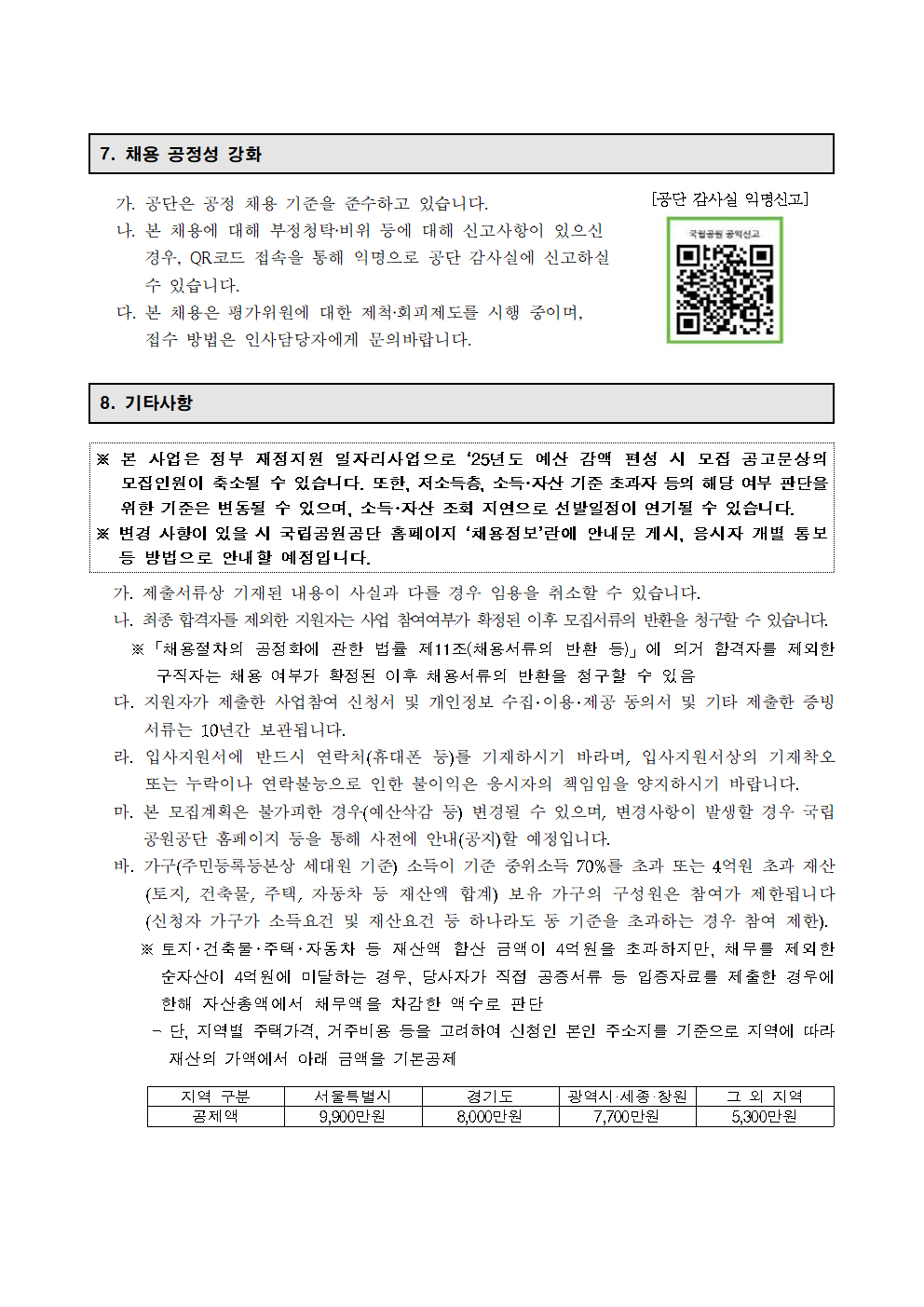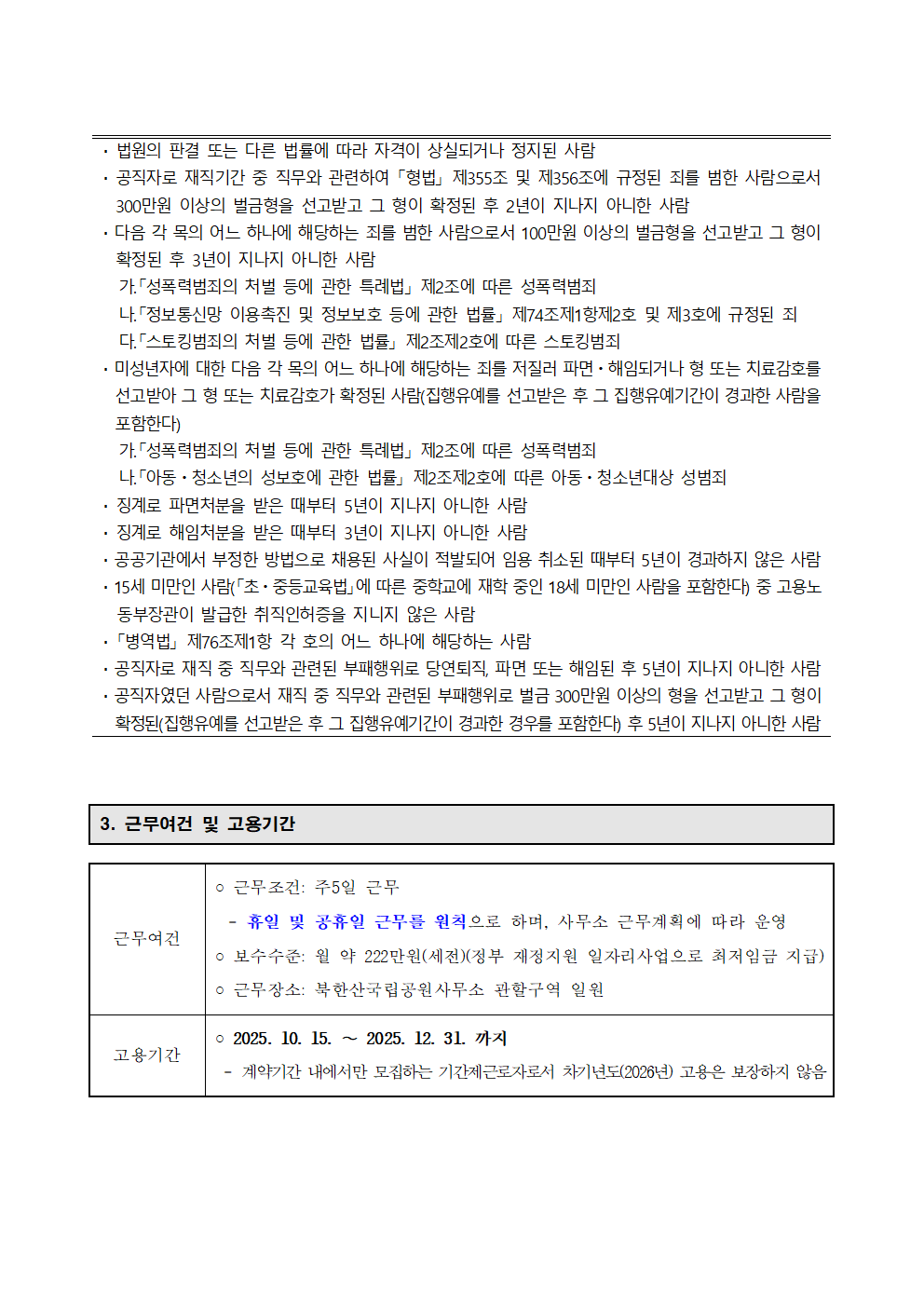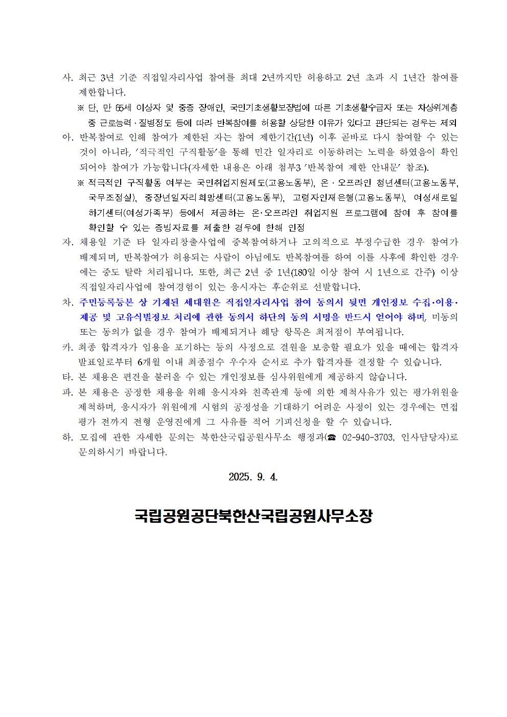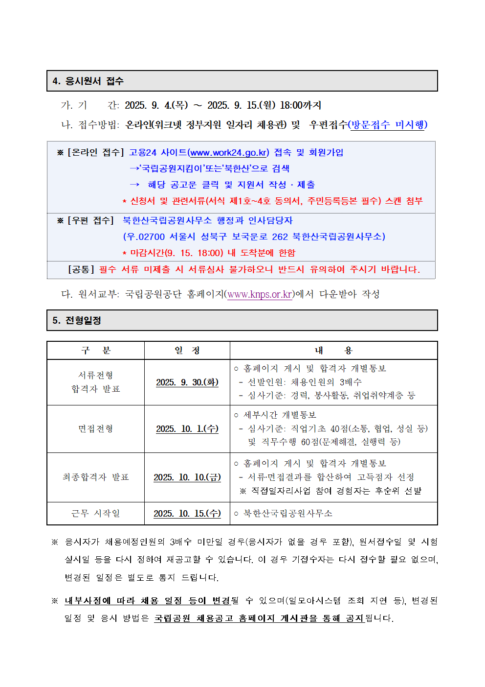 근무내용 *접수기간 : 2025. 9. 4.(목) ~ 2025. 9. 15.(월) 18:00까지 *접수방법 : 온라인(워크넷 정부지원 일자리 채용관) 및 우편접수(방문접수 미시행) *원서교부 : 국립공원공단 홈페이지(www.knps.or.kr)에서 다운받아 작성