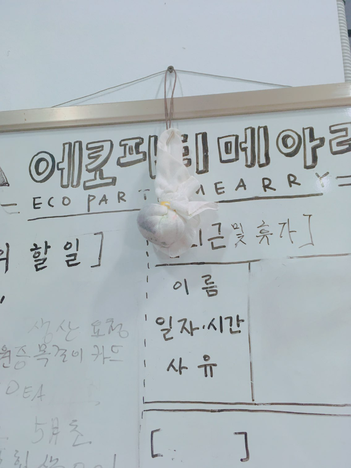 작업실 입구의 화이트보드에도 자투리 천을 사용한 지우개의 모습,