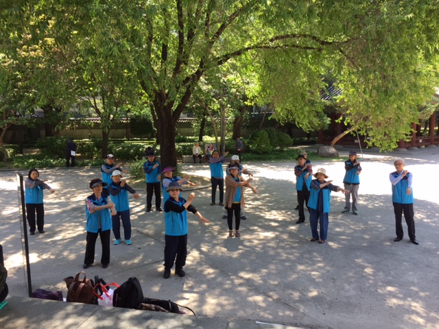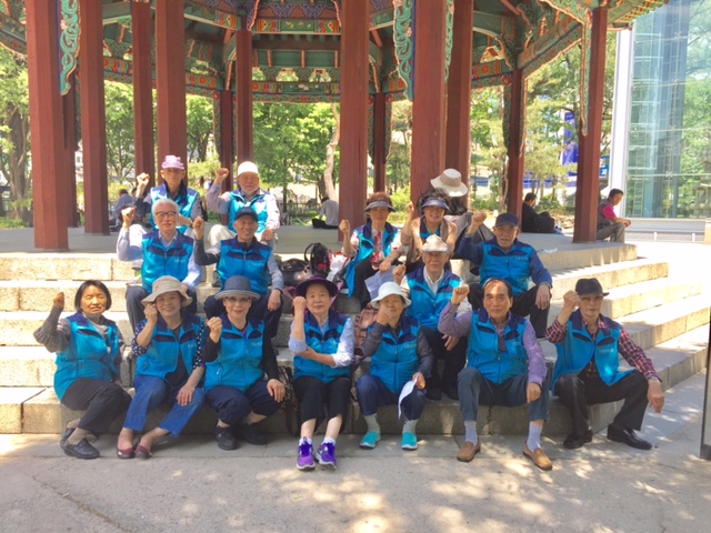 오전 9시 15분 건강체조 시간과 옥상체조를 마치면 질서정연하게 모여 서울노인복지센터에서 탑골공원으로 이동하십니다.