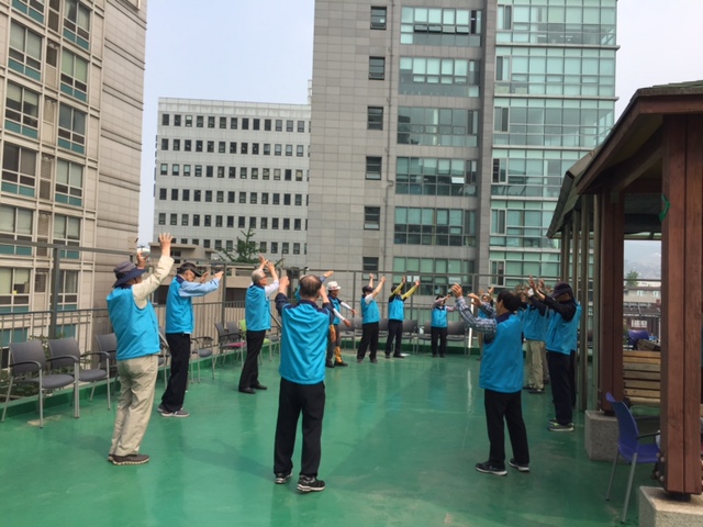 저희 센터의 옥상을 이용하시는 분들이라면 건강지킴이 참여자 분들을 보셨을 겁니다^^ 해가 쨍쨍하게 내리쬐는 오전의 시작을 알리는 건강지킴이 참여 어르신들! 너무 멋지지 않나요?