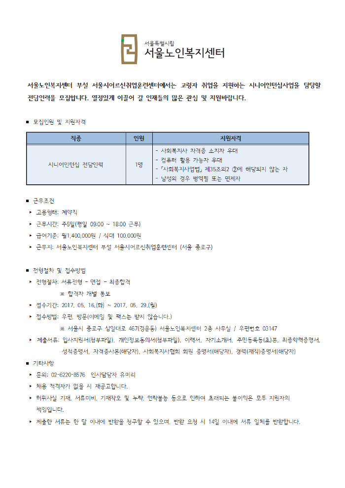 [채용]서울노인복지센터 부설 서울시어르신취업훈련센터 시니어인턴십 전담인력 채용 공고