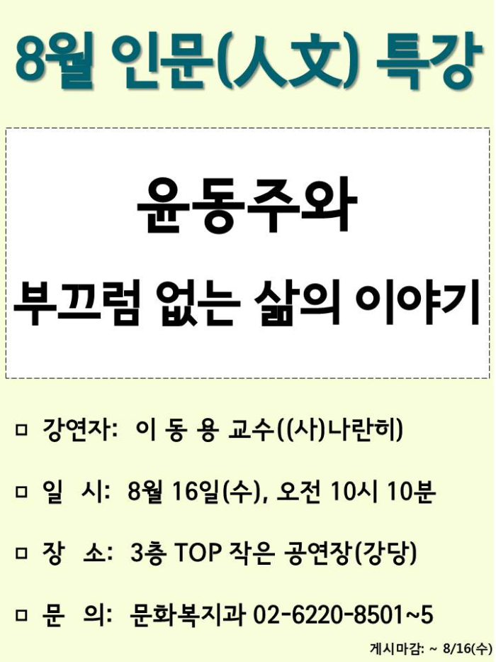 | [공지] | [평생교육팀] 당신의 재능을 마음껏 펼칠 순간! 깜짝 공연할 예술가 모집 |     | 담당자 | 2025-03-07 |