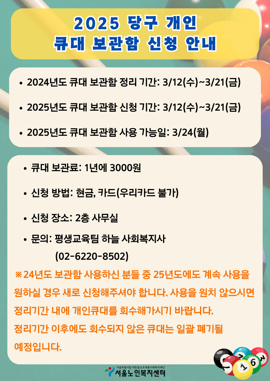[평생교육팀] 2025 당구 개인 큐대 보관함 신청 안내