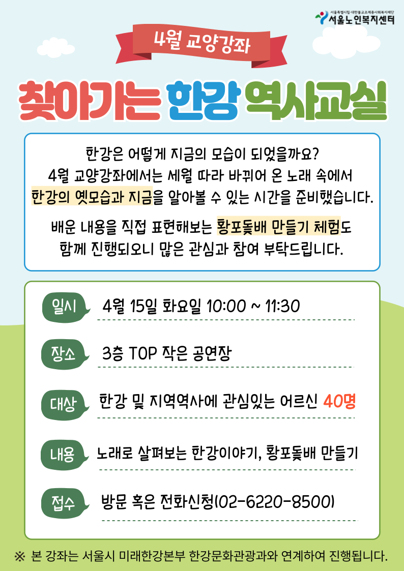 [평생교육팀] 4월 교양강좌 '찾아가는 한강 역사교실' 참여자 모집