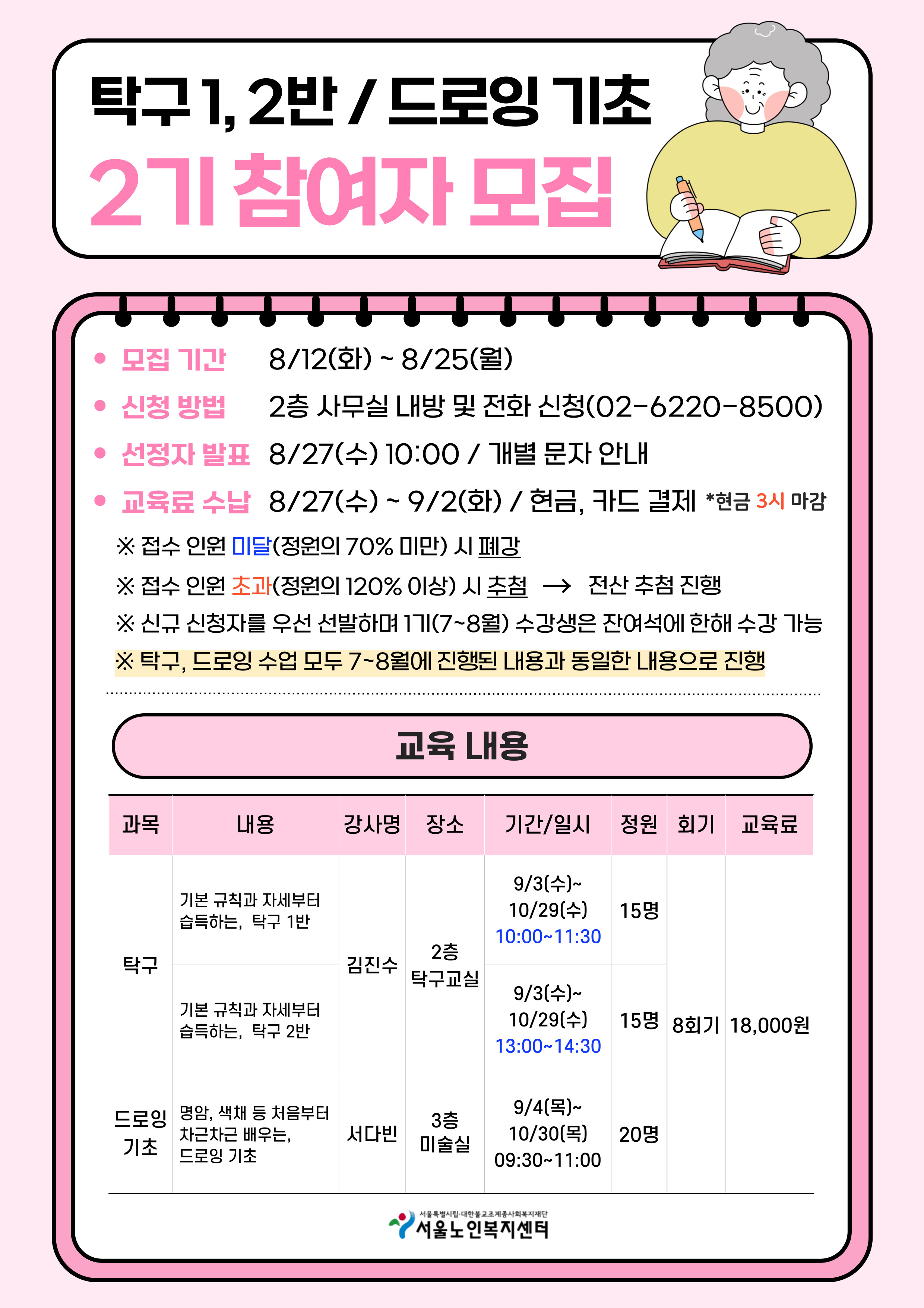 [평생교육팀] 하반기 평생교육 탁구 1,2반 / 드로잉 기초 2기 참여자 모집 안내
