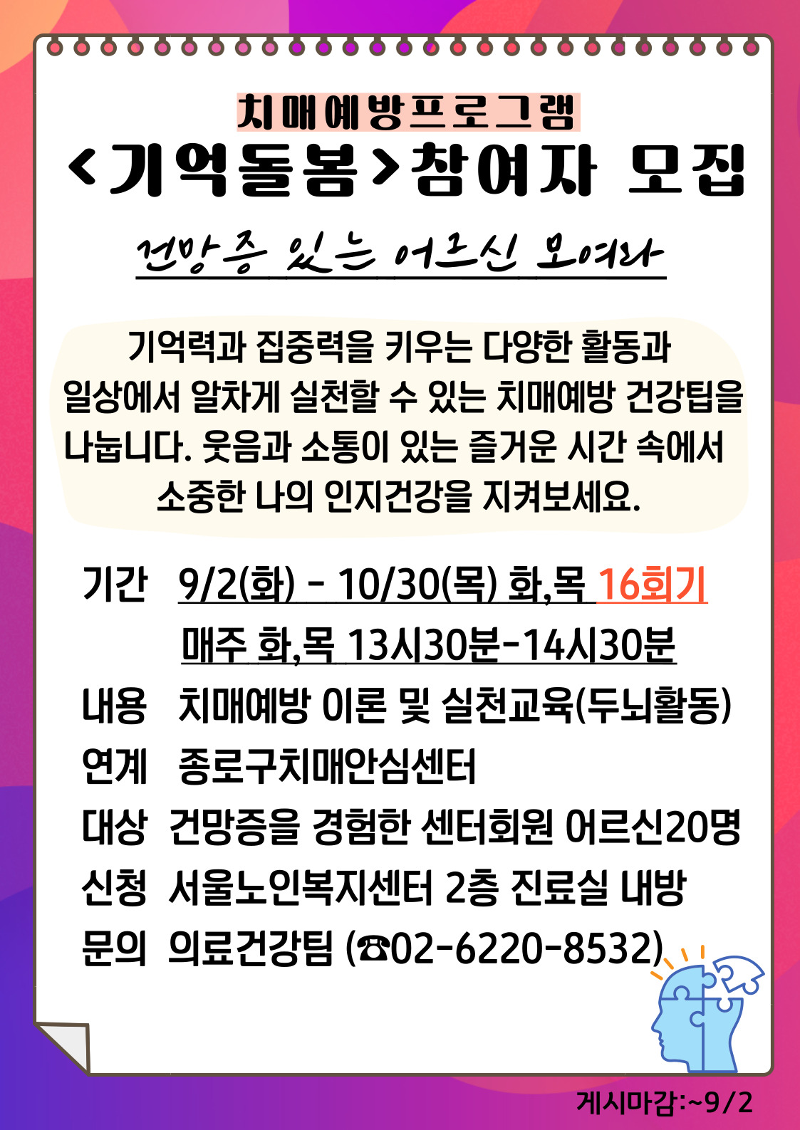 [의료건강팀] 치매예방프로그램 기억돌봄 참여자 모집