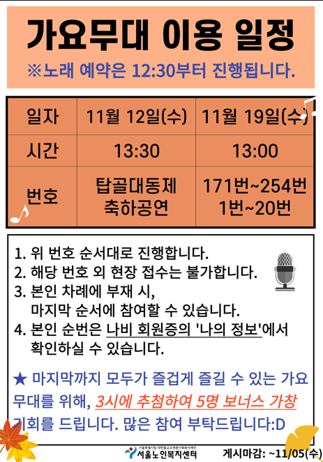 [평생교육팀] 가요무대 순번 공지(11.12/ 11.19)