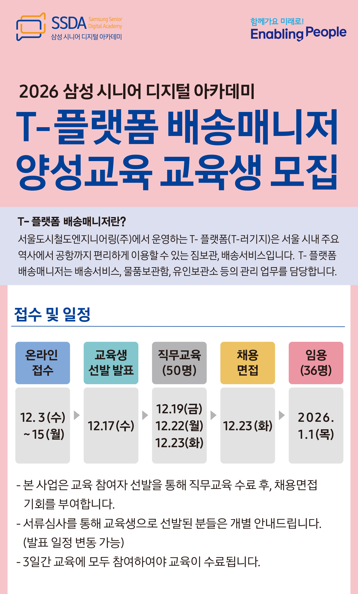 [취업지원팀] 2026년 T-플랫폼 배송매니저 양성교육 교육생 모집