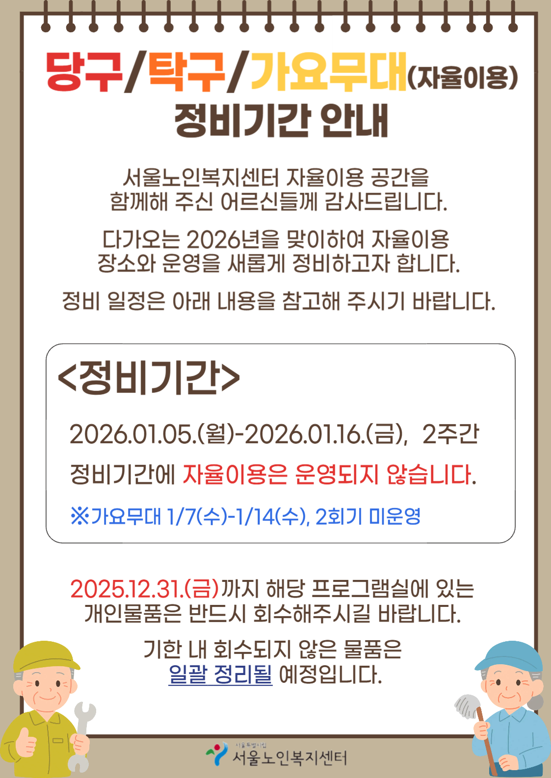| [공지] | [서울노인복지센터] 설 명절 휴관 안내 |     | 관리자 | 2026-02-13 |