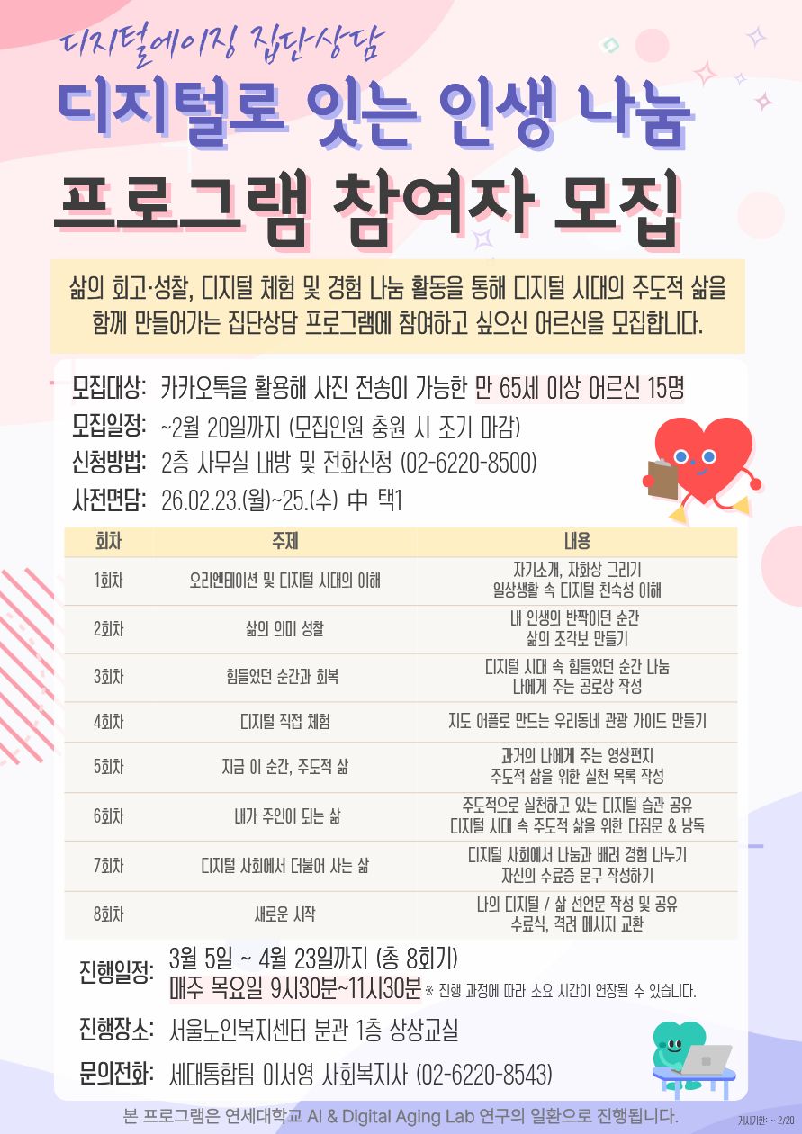 [세대통합팀] 디지털에이징집단상담 <디지털로 잇는 인생나눔 프로그램> 참여자 모집