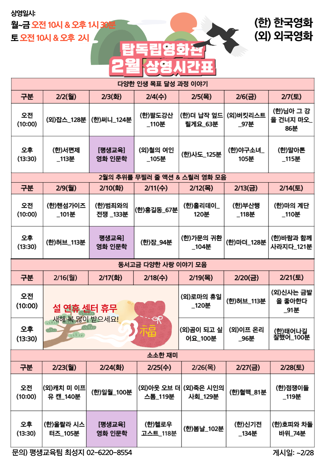 | [공지] | 3월 영화 상영시간표 |     | 담당자 | 2026-02-24 |