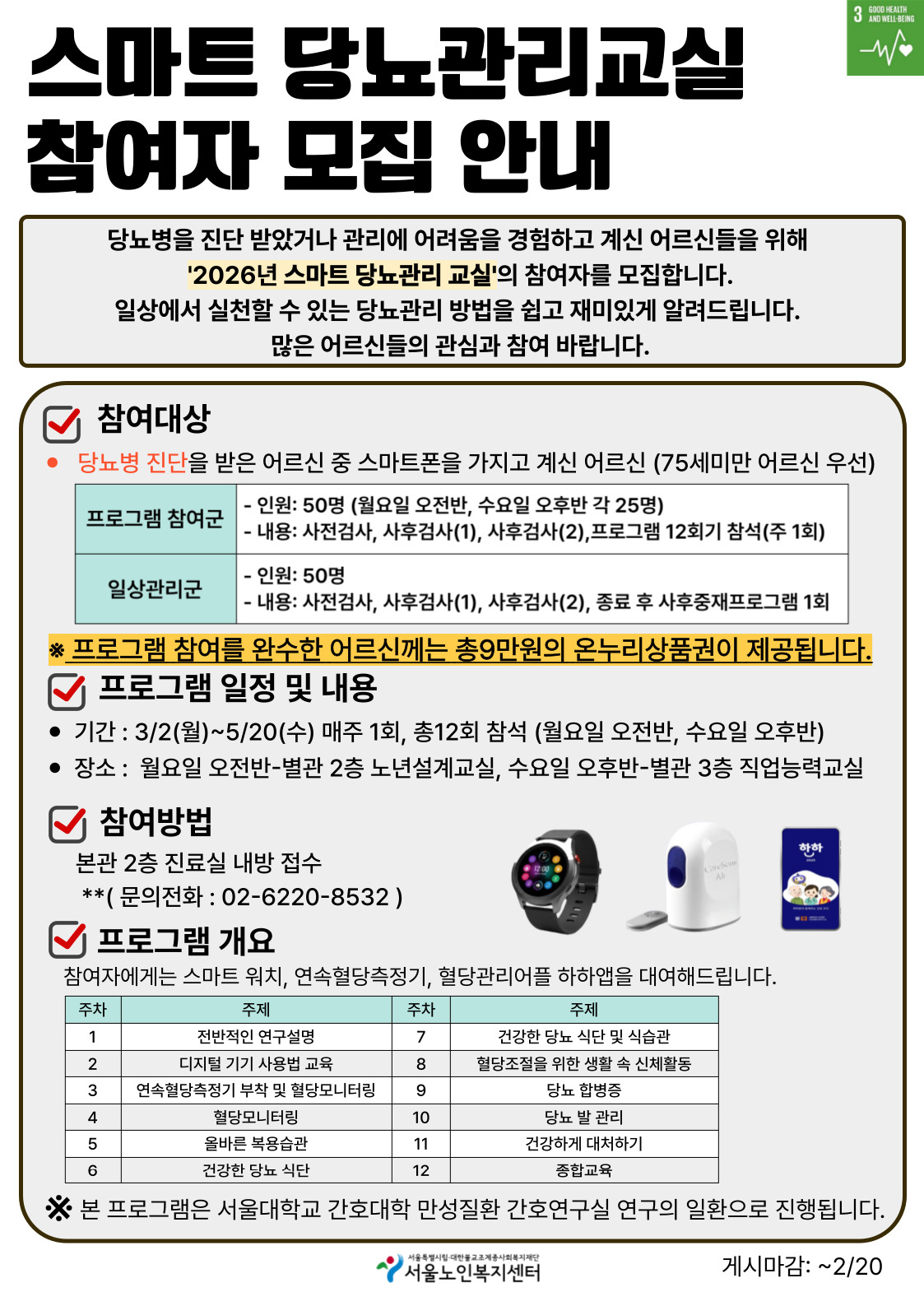 | → | [의료건강팀] 스마트 당뇨관리교실 참여자 모집 안내 |     | 담당자 | 2026-02-12 |