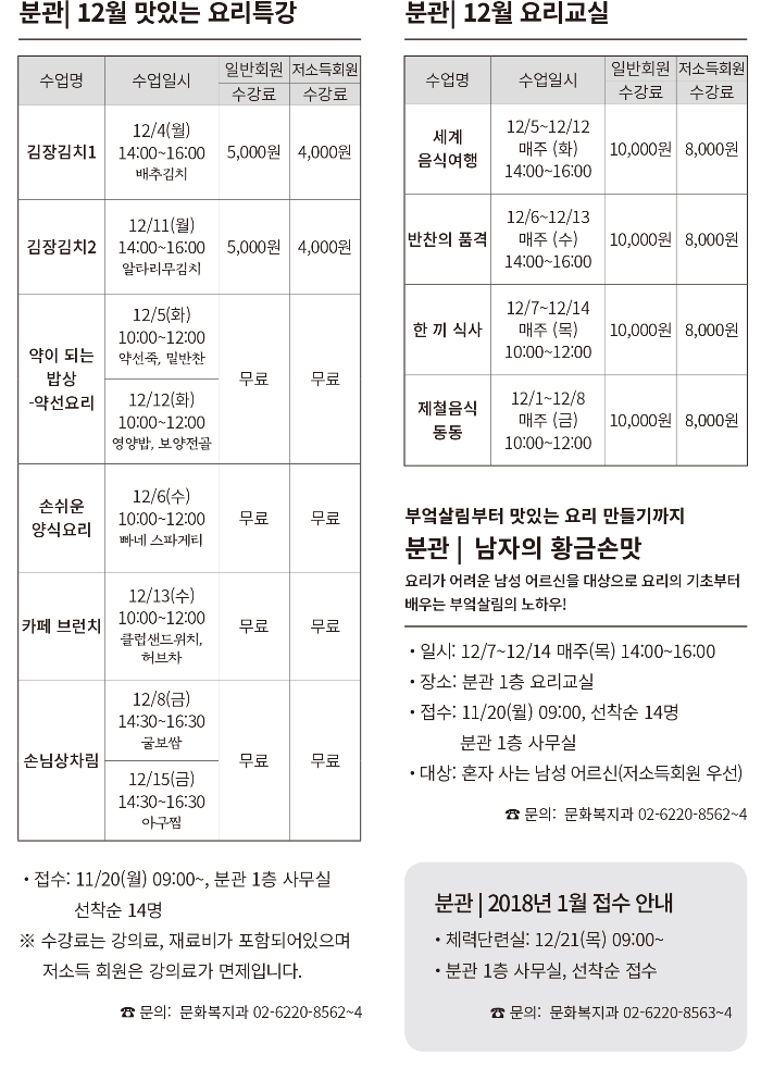 서울노인복지센터 분관 요리교실에서 진행되는 12월 강좌 안내입니다.