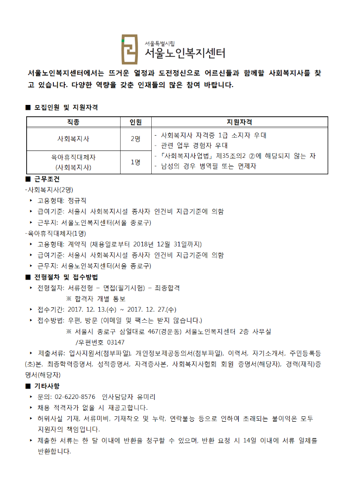 [채용] 서울노인복지센터 사회복지사 및 육아휴직대체자(사회복지사) 채용 공고