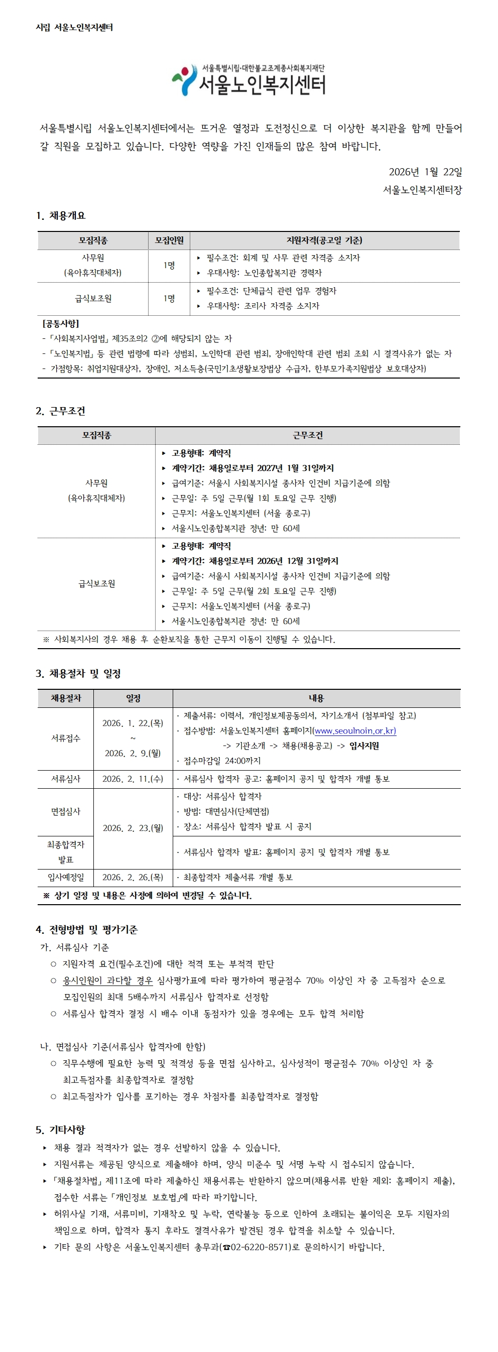 서울노인복지센터 직원 채용 공고(육아휴직대체자(사무원), 급식보조원) ㅣ 서류접수중