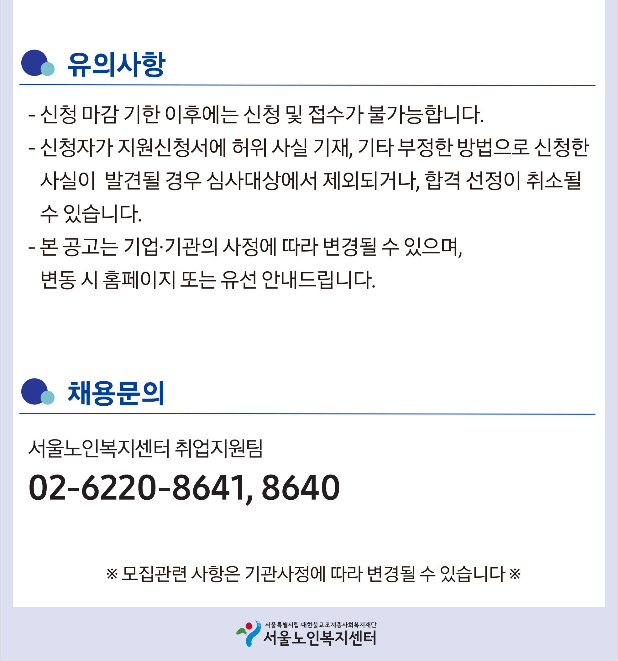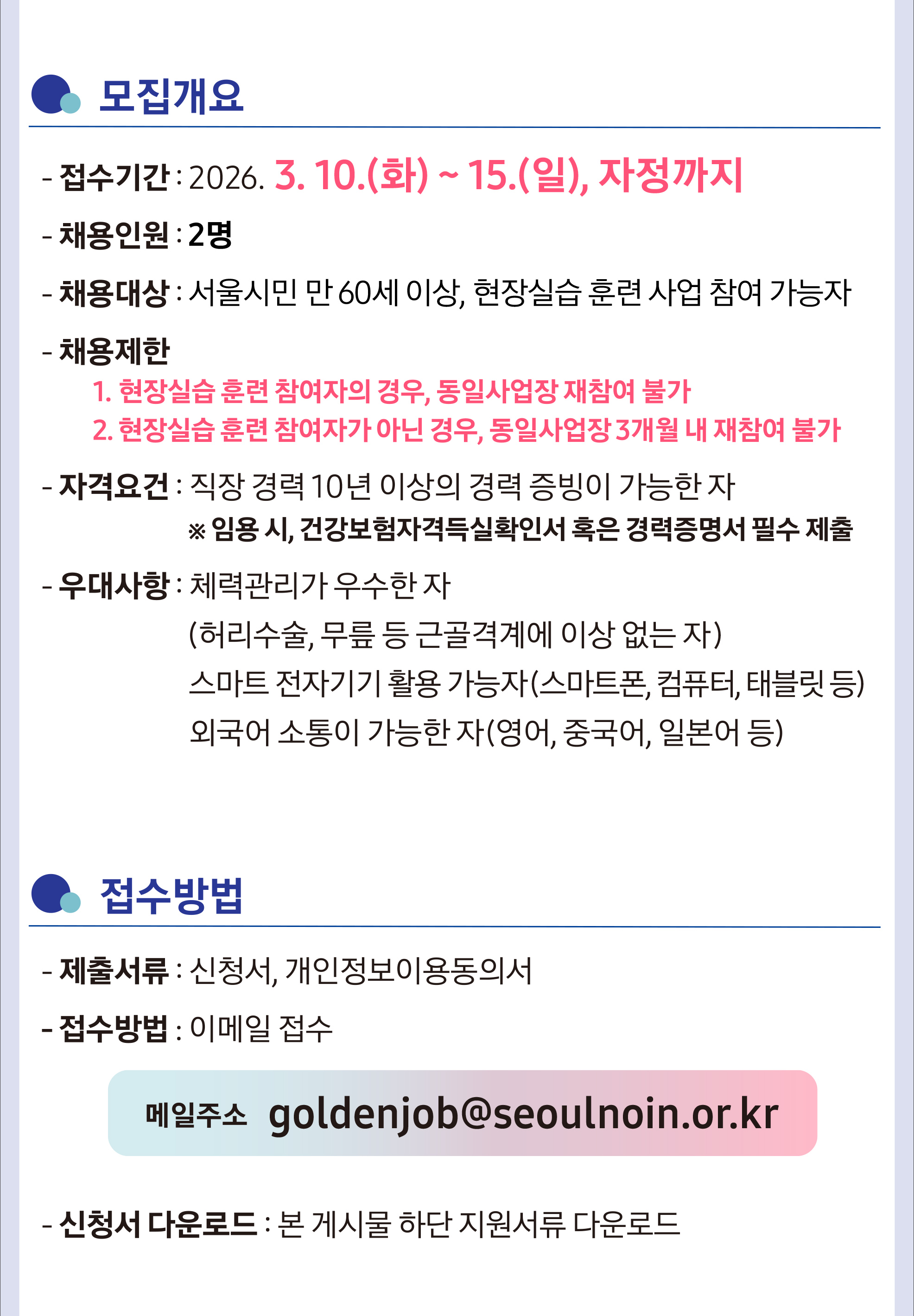 근무내용 ※ 본 공고는 현장실습 훈련 참여 일자리로, 배송매니저 및 물류매니저로 기존 활동경험이 있는 경우, 재참여가 불가합니다. 접수기간 : 26. 3. 10.(화)~15.(일), 마감일까지 이메일접수 : goldenjob@seoulnoin.or.kr ![]() ![]() ![]() ![]() ![]() |
