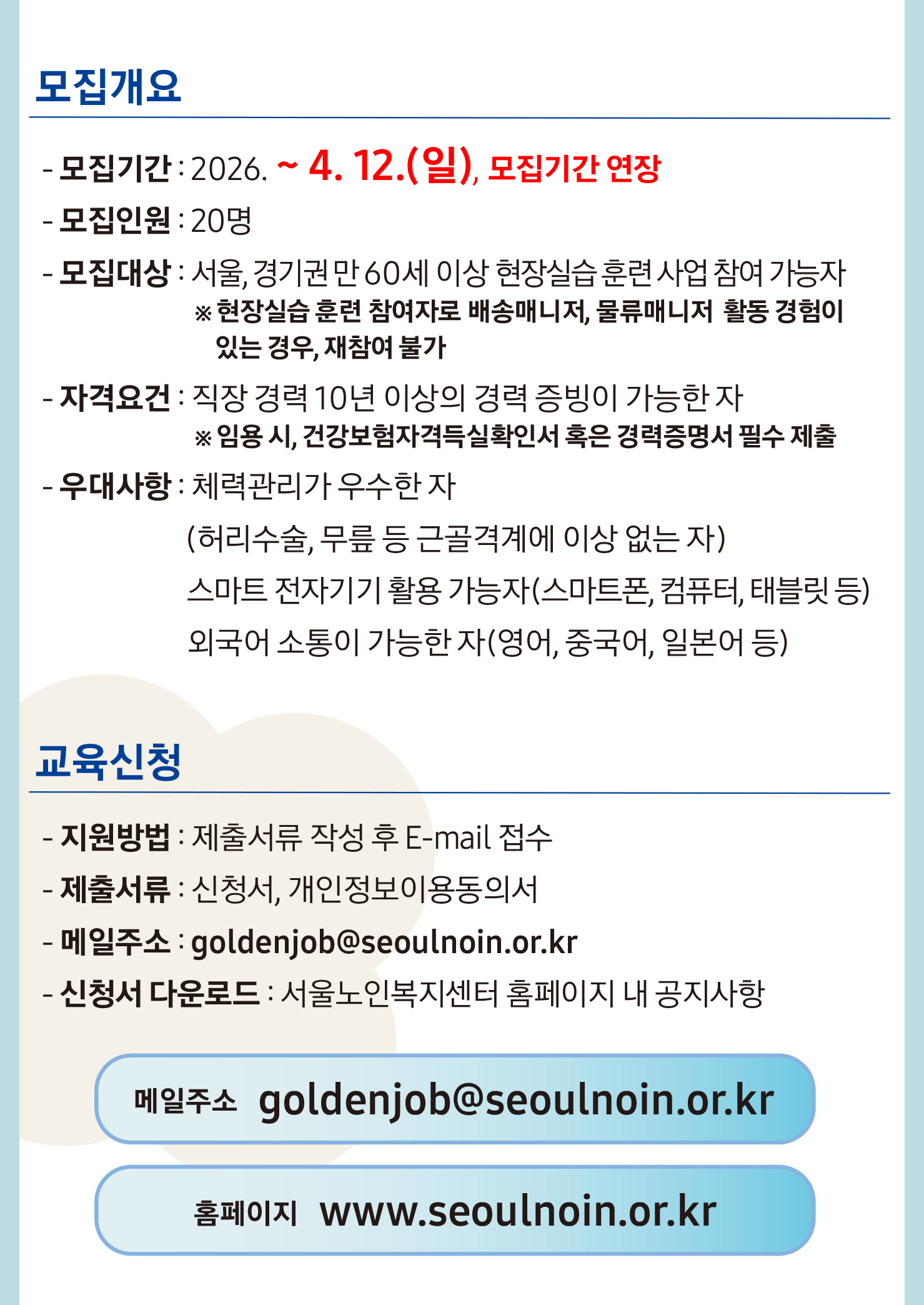 근무내용 ※ 본 공고는 현장실습 훈련 참여 일자리입니다. 현장실습 훈련 참여자로 배송매니저, 물류매니저 활동 경험이 있는 경우 재참여가 불가합니다. ![]() ![]() ![]() ![]() ![]() 1. 접수 : 3.30(월) ~ 4.12(일), 모집기간 연장 2. 대상 : 서울 및 경기권 만 60세 이상 3. 모집 : 교육생 20명 4. 채용 : 11명(교육 수료자 대상 면접기회 제공) 5. 방법 : 이메일접수 goldenjob@seoulnoin.or.kr 6. 서류 : 신청서, 개인정보동의서 7. 대상 : 서울 및 경기권 만 60세 이상 8. 자격 : 직장 경력 10년 이상 근무자로 경력 증빙이 가능한 자 9. 우대 - 스마트 전자기기 활용 가능자(스마트폰, 컴퓨터, 태블릿 등) - 근골격계에 이상 없는 자(허리수술, 무릎 등) - 외국어 소통이 가능한 자(영어, 중국어, 일본어 등) 9. 문의사항 : 서울노인복지센터 02-6220-8641 |