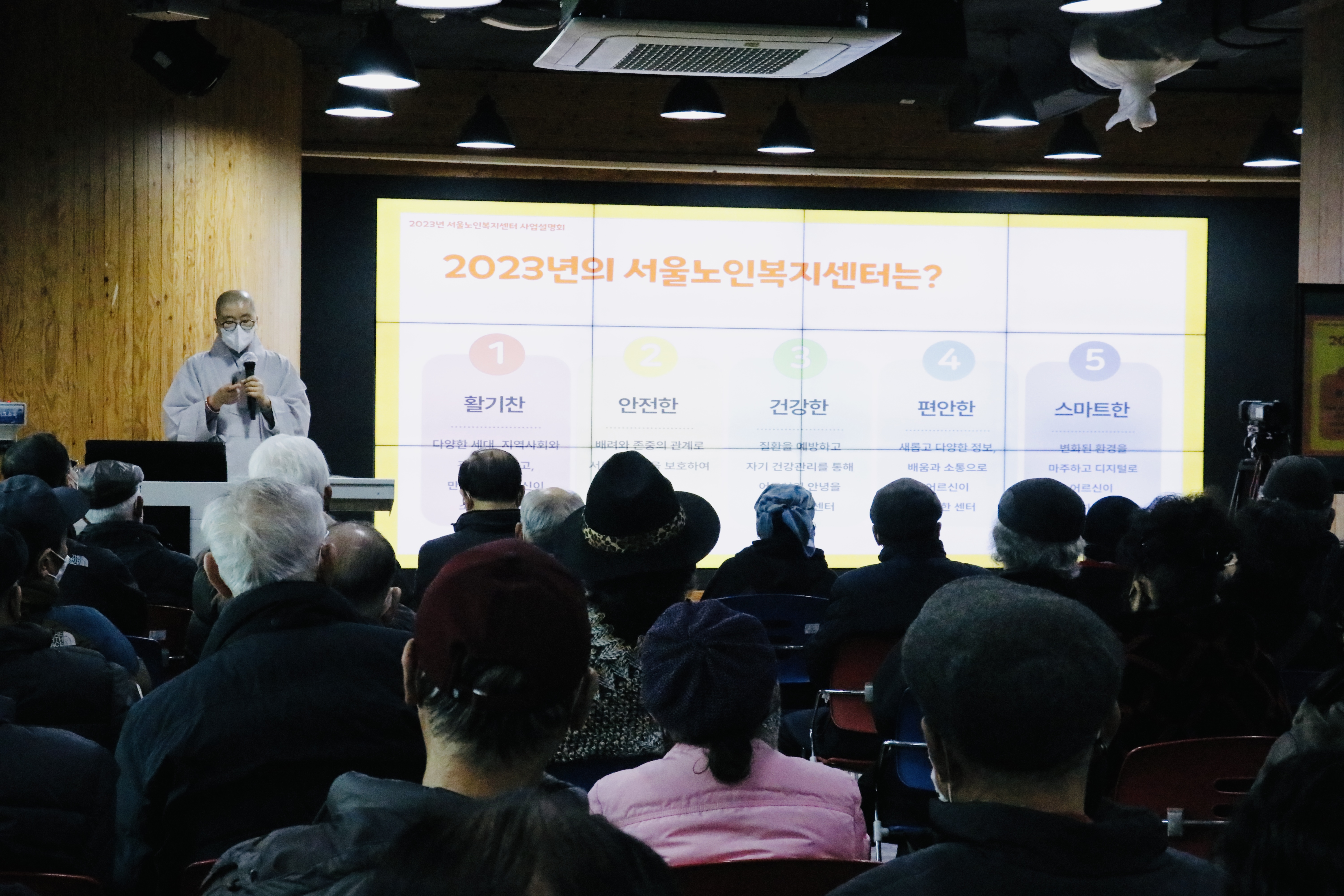 2023년 서울노인복지센터, 선배시민과 만들어가는 사업설명회 개최 100만 선배시민이 참여하고 배우고 나누는 광장, 서울노인복지센터에서는 지난 2월 10일, 어르신과 함께 올해의 운영 방향과 주요 사업에 대한 이해를 돕고자 사업설명회를 개최하였습니다. 어르신의 다양한 목소리를 듣기 위해 마련된 자리, 그 뜨거운 관심과 열기의 현장을 들여다봅니다.