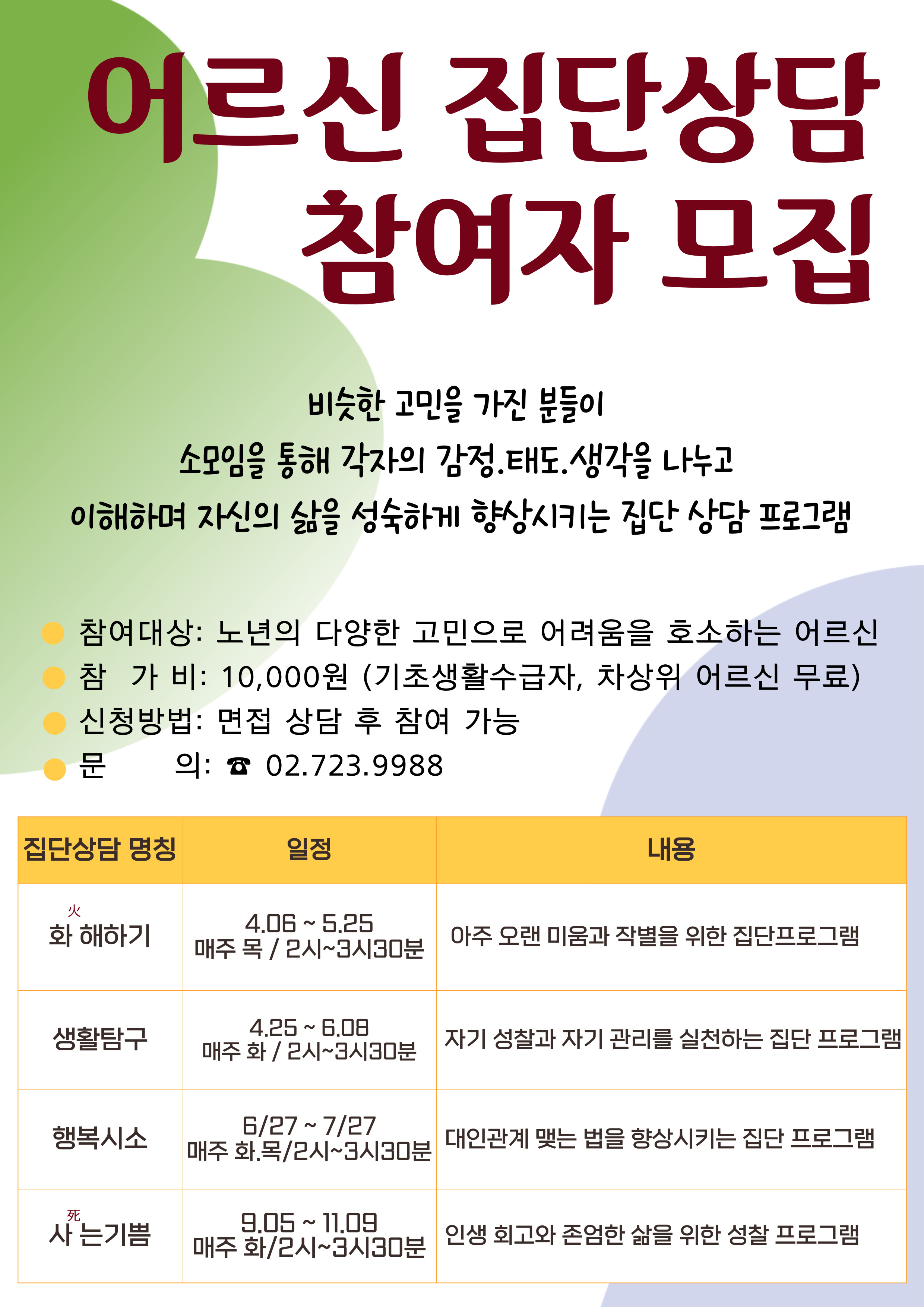 비슷한 고민을 가진 분들이 소모임을 통해 각자의 감정. 태도. 생각을 나누고 이해하며 자신의 삶을 성숙하게 향상시키는 서울시어르신상담센터 집단 상담 프로그램, 어르신 참여자를 모집합니다. |