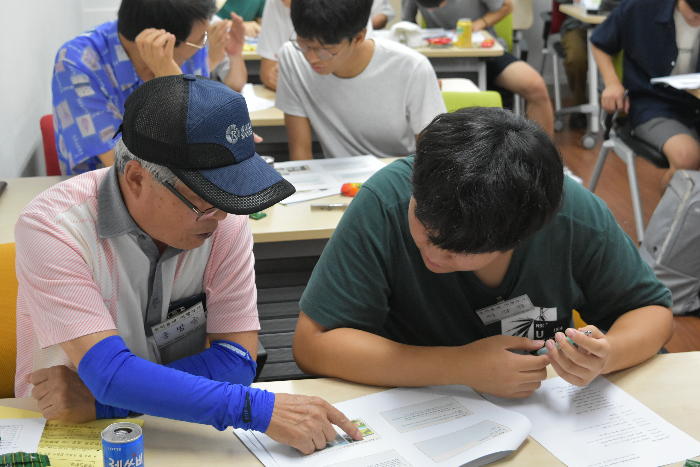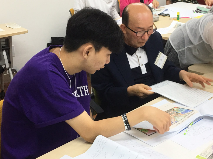 다음으로 참여 어르신들이 사전에 작업했던 ‘내 마음의 고향’에 대한 작업물을 함께 보면서 학생들과 자유롭게 소통하는 시간을 가졌습니다. 교육장은 마치 시장처럼 시끌시끌했지만, 그들의 이야기는 할아버지, 할머니가 친 손주에게 옛날이야기를 해주듯이 따뜻한 이야기로 가득찼습니다.