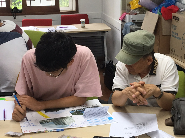 10일에 진행되었던 9회기 수업은 지난 만남을 통해 어르신들의 ‘내 마음의 고향’에 대한 이야기를 전해들은 중앙고등학교 학생들이 어르신의 정보를 토대로 지도를 만들어옴으로써 이를 두고 다시 서로 이야기를 나누는 시간을 가졌습니다. 어르신들은 학생이 그려온 지도를 이리저리 가리키며 “이 곳에는 예전엔 강물이 흐르고 있었고 친구들과 많이 놀았던 곳이야.”, “예전에는 여기가 극장이었단다.” 등의 말씀을 하시면서 귀중한 본인의 인생의 시간을 학생들과 같이 공유했습니다. 학생들은 이를 경청하고, 본인이 만들어온 지도에 다양한 방법으로 기록하면서 어르신만의 ‘우리동네지도’를 완성해나갔습니다.