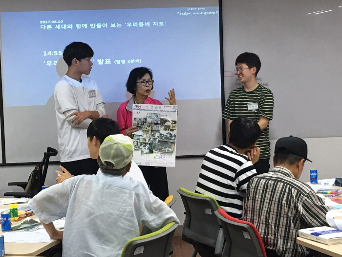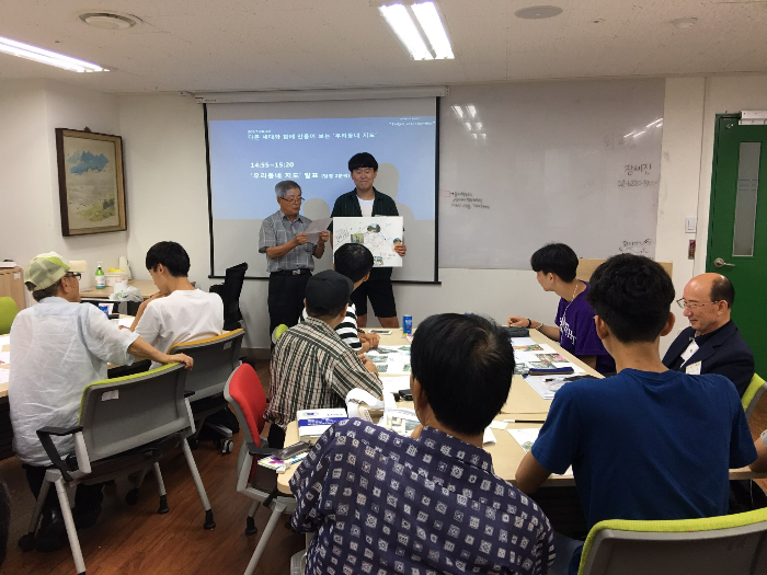다음으로 학생들과 어르신이 함께 만든 ‘우리동네지도’를 발표하는 시간을 가졌습니다. 긴 시간이 부여되지 않음에도 불구하고 개성 넘치고 근사한 작업물들이 등장했습니다. 더불어 2분이라는 발표시간이 매우 짧을 정도로 많은 이야깃거리들이 쏟아져 나왔습니다.