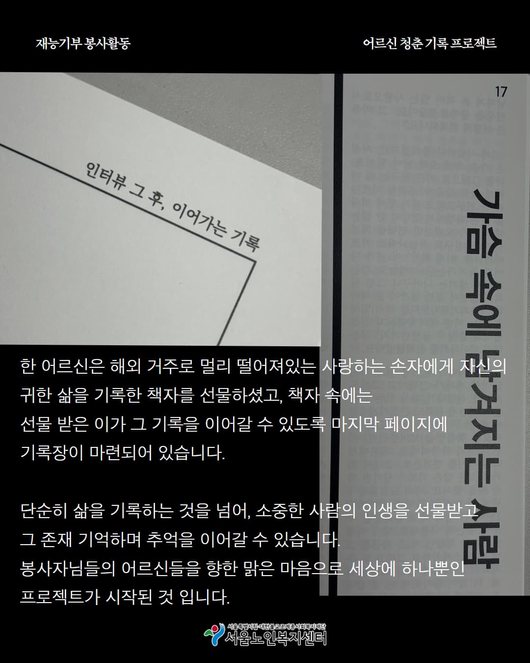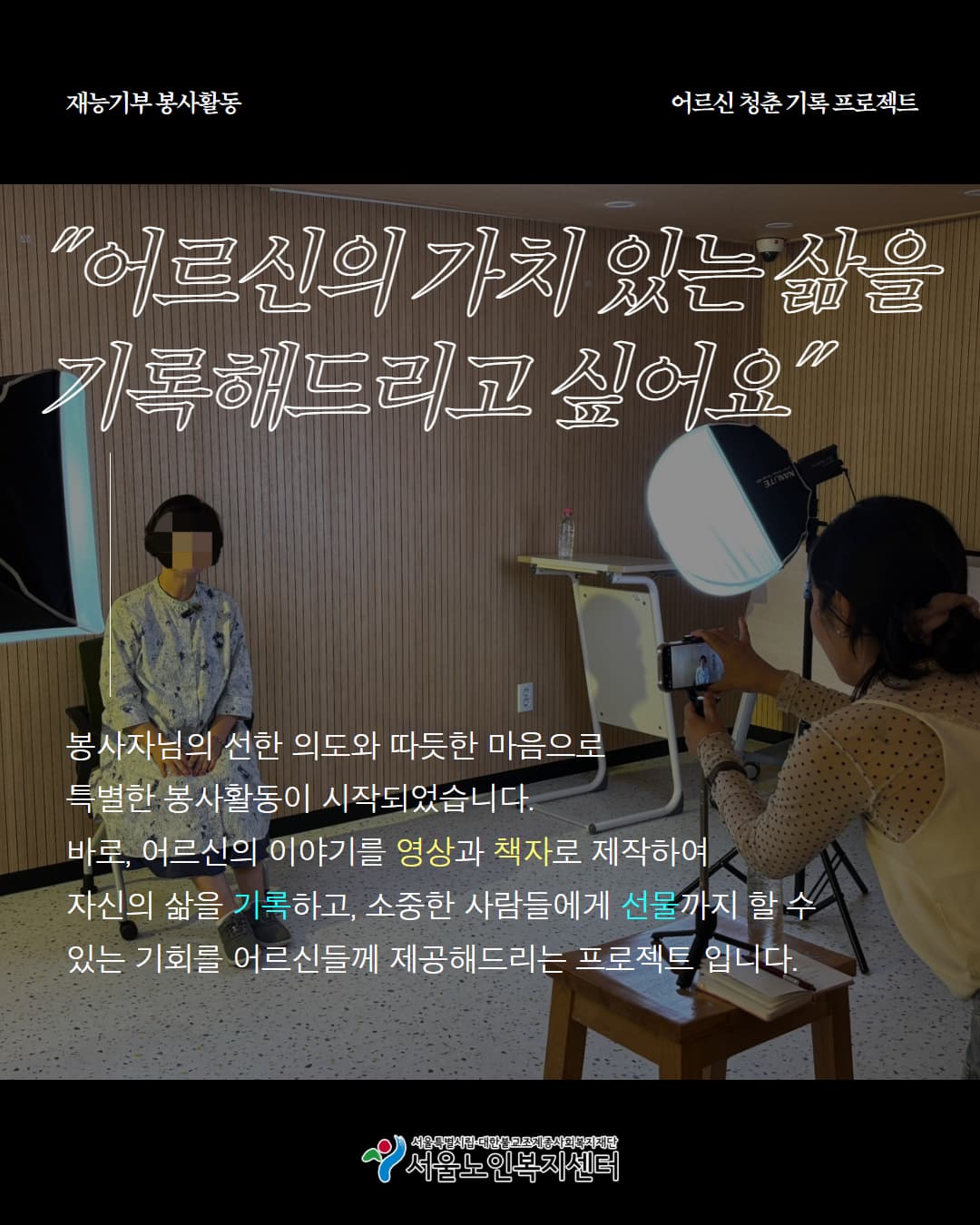 봉사자님들의 재능기부로 어르신의 삶과 청춘을 영상과 책자로 기록해드리고,