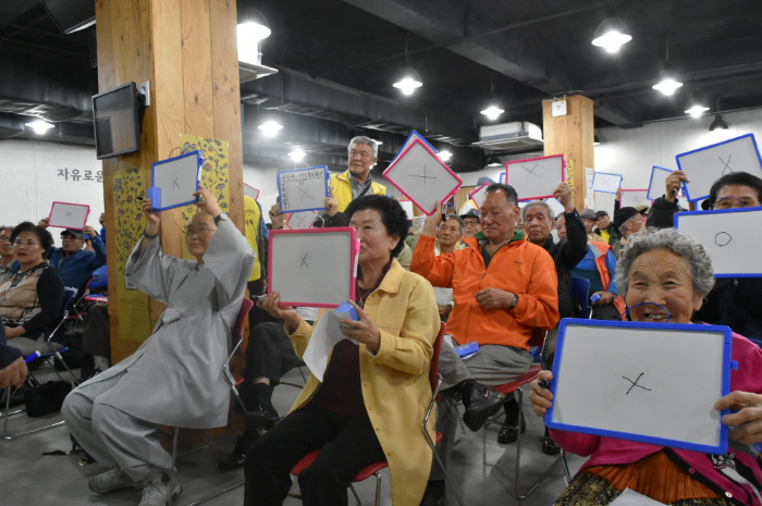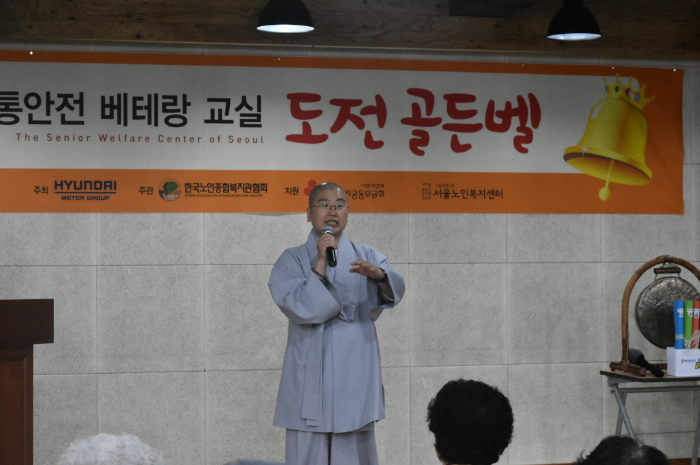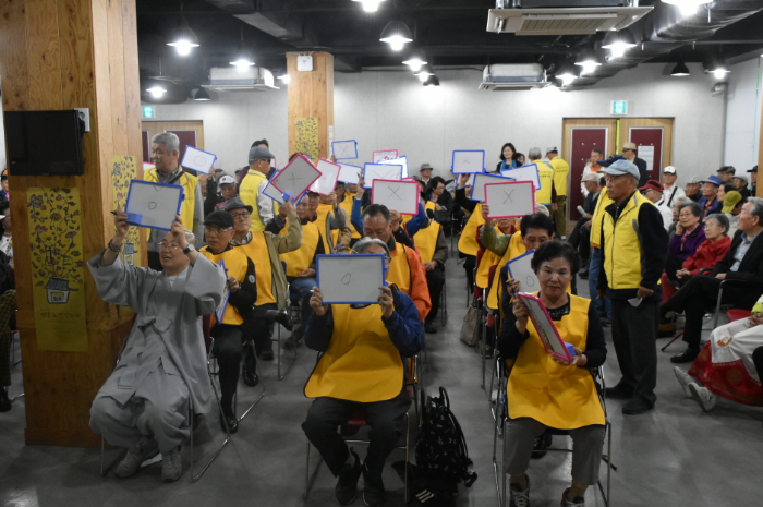 여는 무대로 건강지킴이 어르신들의 상어가족 체조로 골든벨 참가자들을 응원해 주었다. 그리고 관장스님의 인사말씀을 시작으로 김광수 어르신과 박동수 사회복지사의 공동 사회로 퀴즈대회를 열었다.