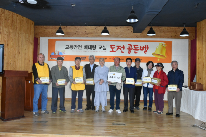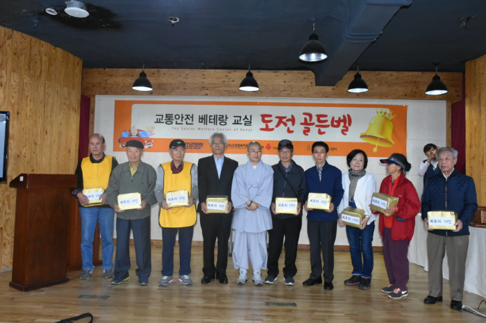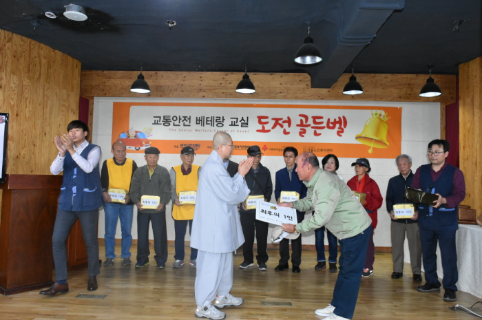 드디어 골든벨이 울리고 최후의 10인에 대한 시상과 최후 1인에 대한 시상을 관장스님께서 해 주셨다. 이날 최후의 10인이 되신 분들에게는 중앙골든벨에 출전할 자격이 주어졌다. 지난 6개월간의 프로그램을 통하여 익힌 교통안전 지식을 점검하는 즐거운 자리로 참여자와 관객 모두 열정 넘치는 하루였다.