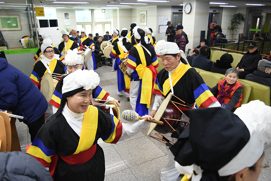 풍물 동아리의 신명나는 지신밟기가 서울노인복지센터 3층에서 시작되었습니다.