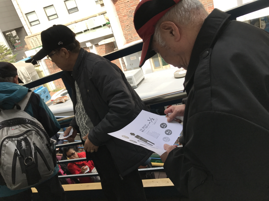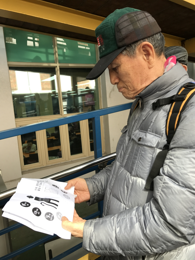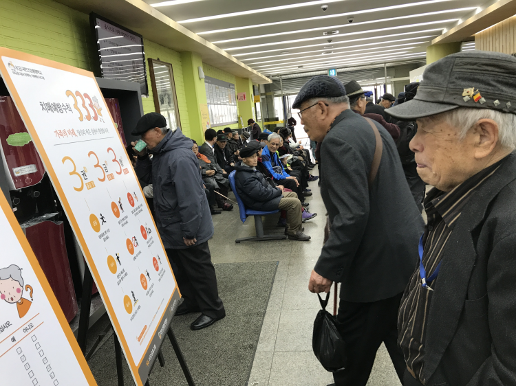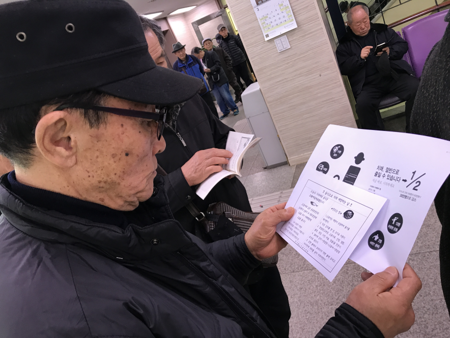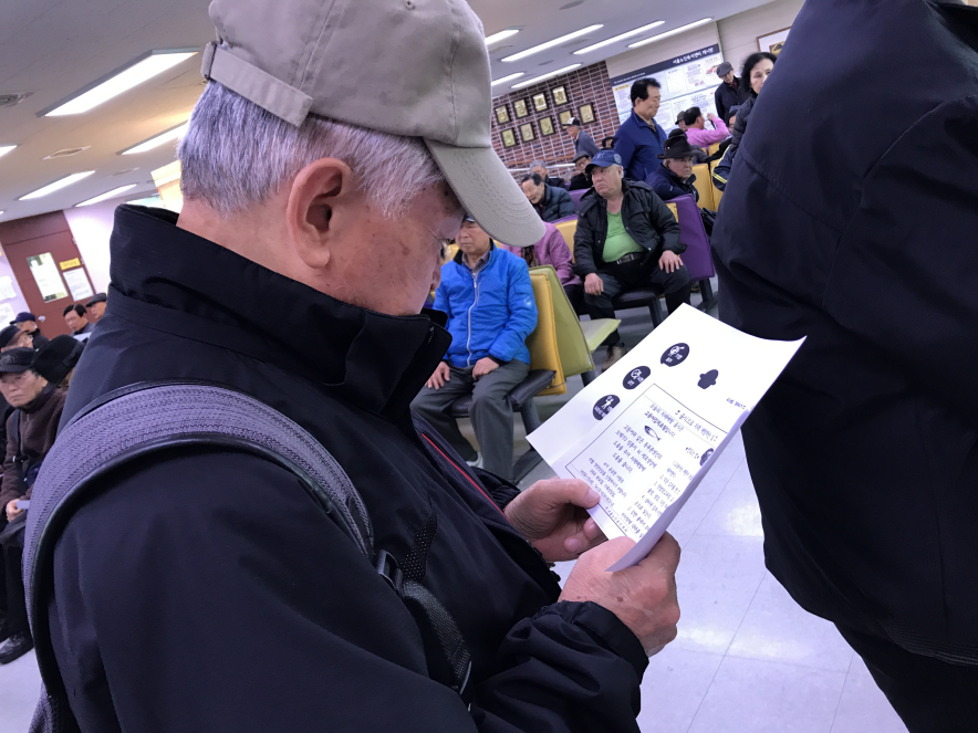 식당 입장 대기 중 영양정보지를 읽는 어르신들 모습입니다.