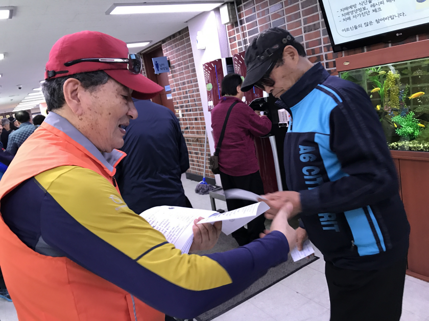 참여하고, 배우고, 나누는 선배시민 답게 안전지킴이 어르신께서 식사 이용 어르신들께 영양정보지와 레시피, 치매 예방정보지를 배부하고 있습니다.