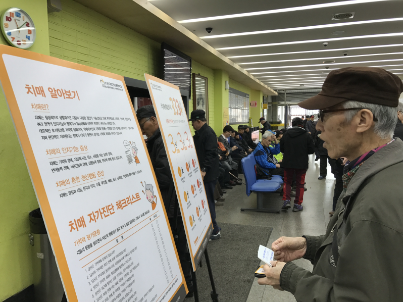 경로식당 출구에는 치매 자가진단과 예방법 정보물을 게시하였습니다.