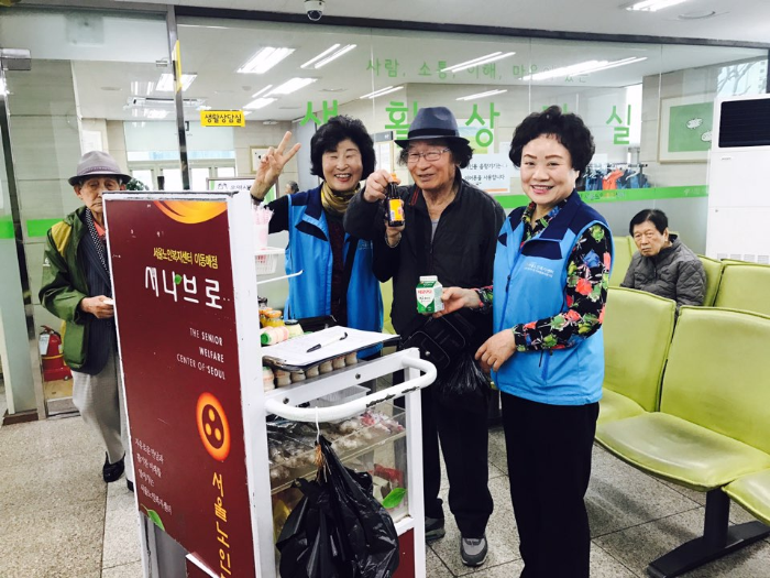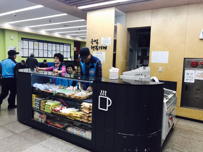 매점은 서울노인복지센터 1층 식당 앞에 위치하고 있으며 매대와 이동매대 두가지 방법으로 활동을 하고 계시고 ,이동매대 어르신들은 본관 1층부터 3층, sk 분관을 다니시며 센터어르신들의 편의를 위해 판매활동을 하고 계십니다.