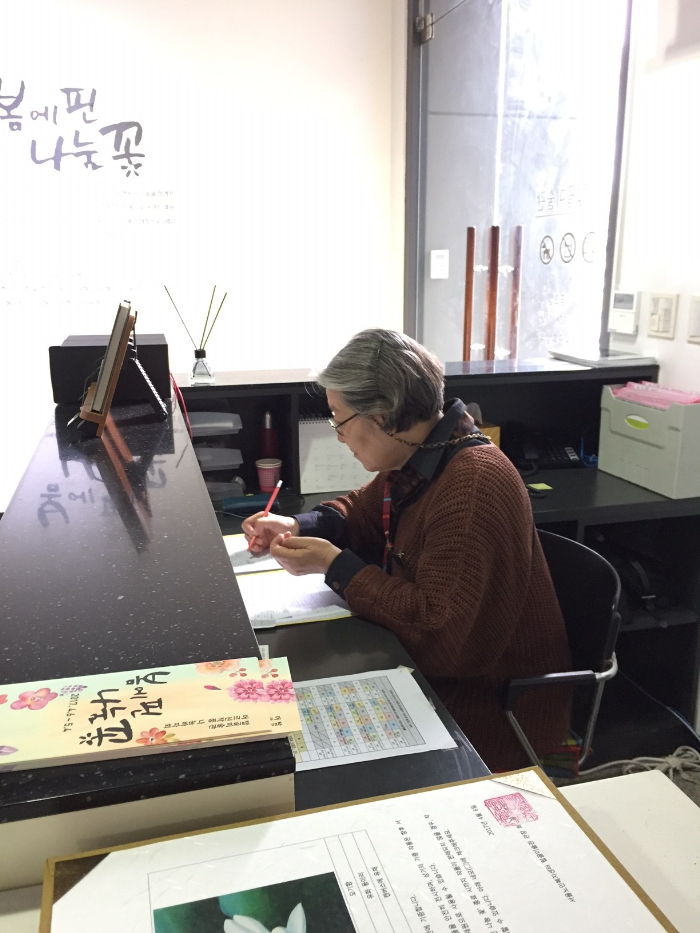 실버도슨트는 오전과 오후 근무를 나누어 활동을 하고 있습니다. 주 활동내용은 작품에 대한 안내, 판매 및 관리를 하며, 하루 동안의 관람객 수 체크와 작품을 기증한 작가의 기증서 관리도 합니다.