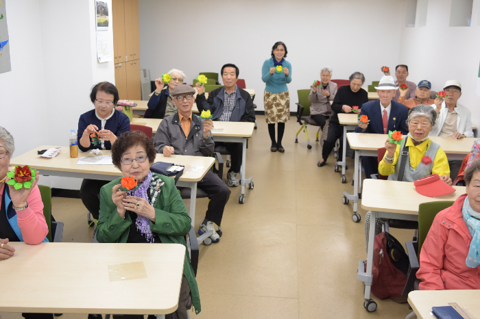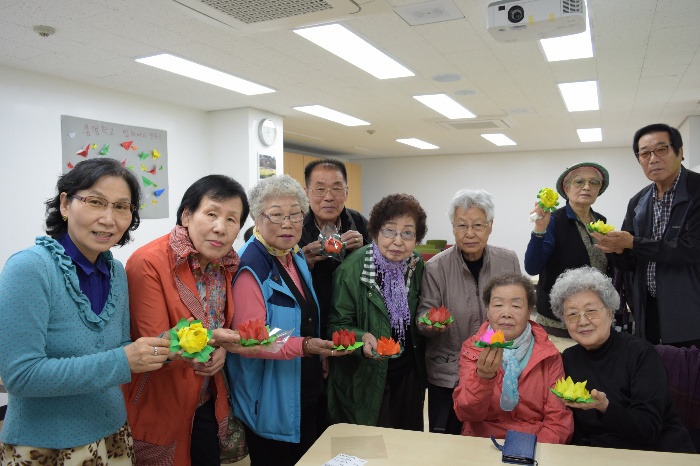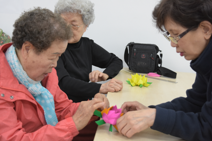 집중하고, 또 어려운 부분에서는 도움받으며 어르신의 열정으로 예쁜 입체연꽃이 완성되었습니다.