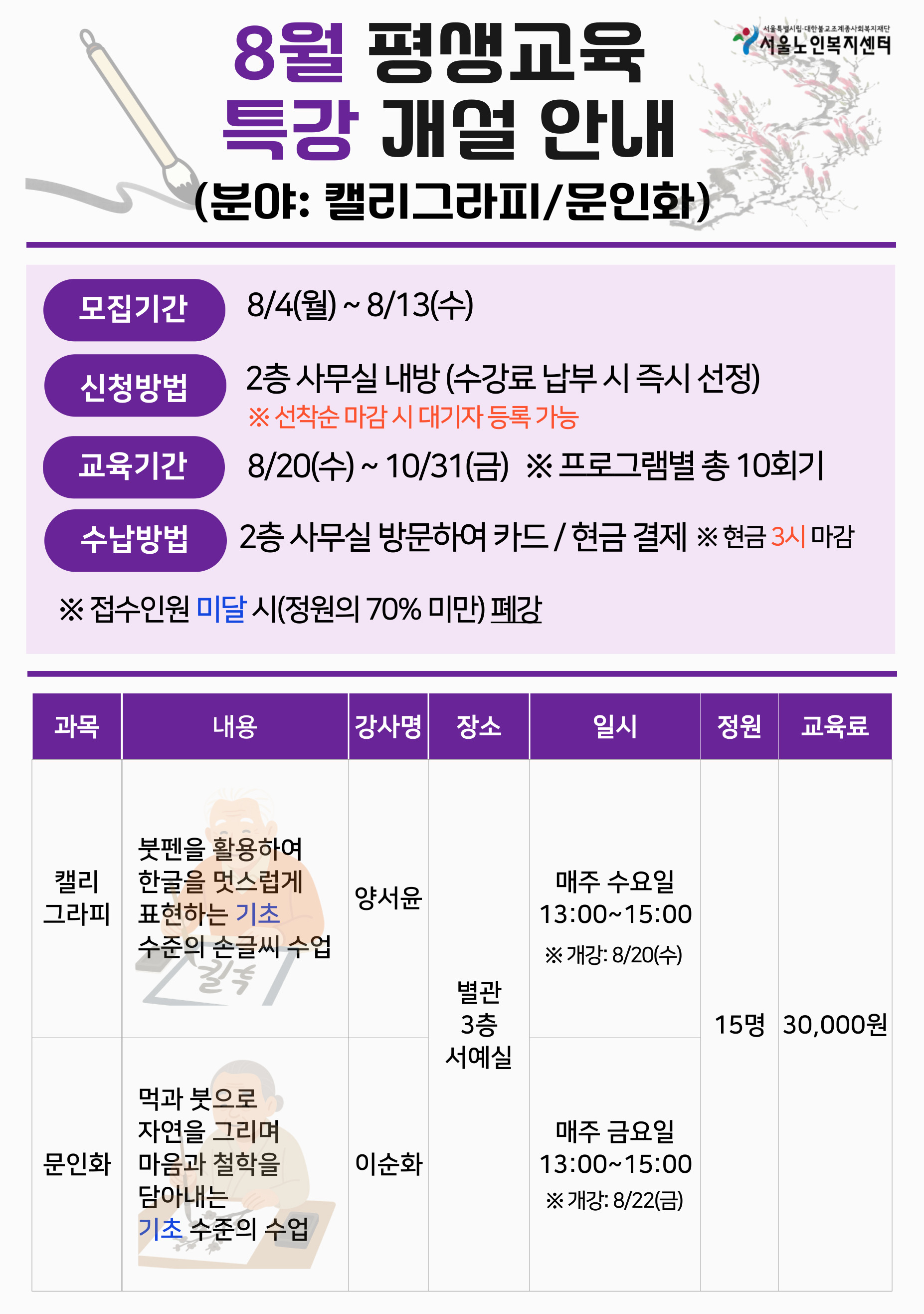 [평생교육팀] 8월 평생교육 특강(캘리그라피, 문인화) 참여자 모집 안내