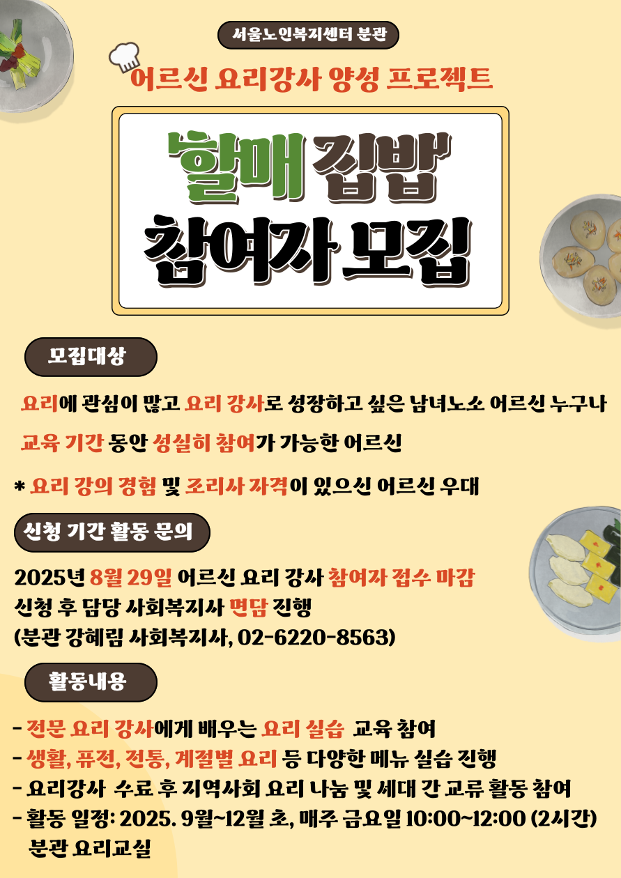 [교육여가문화팀] [분관] 2025년 요리강사양성과정 '할매집밥' 참여자 모집