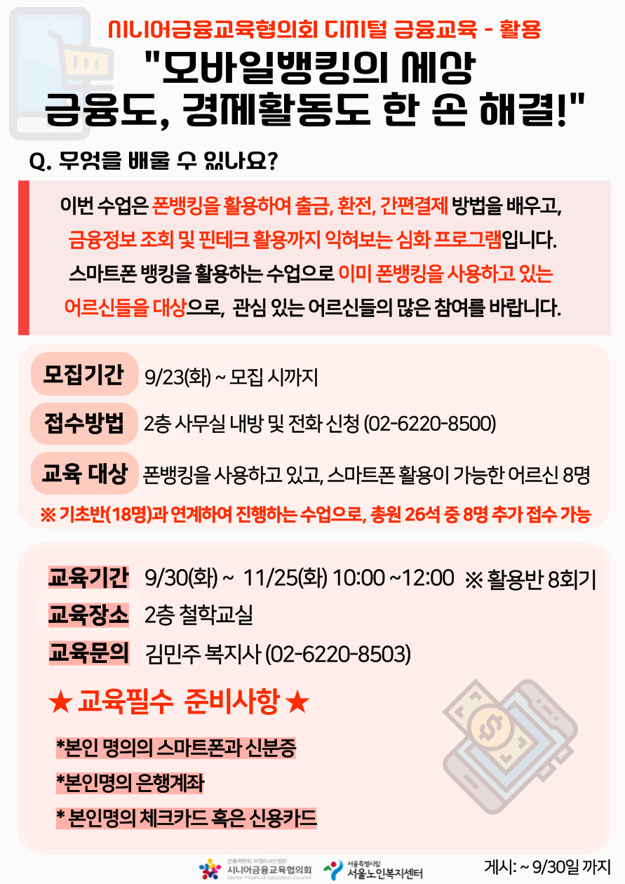 [평생교육팀] 시니어금융교육 모바일 폰뱅킹 활용반 모집 안내