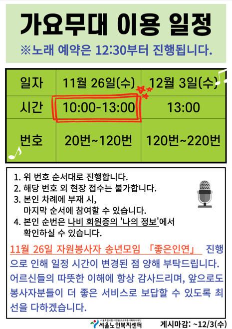 [평생교육팀] 가요무대 순번 공지(11.26/12.03)