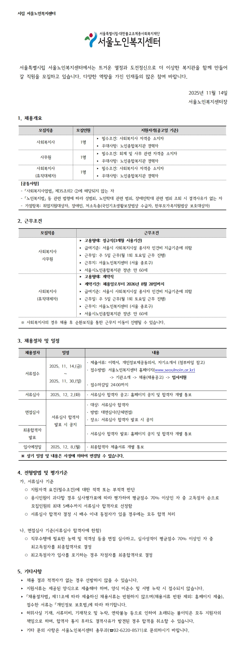 서울노인복지센터 직원 채용 공고(사회복지사, 사무원, 휴직대체자(사회복지사)) ㅣ 서류접수마감