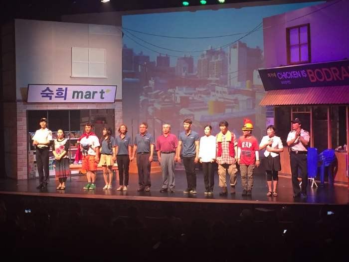 연극 중에는 사진 촬영이 금지인 관계로 배우분들의 마지막 인사장면을 촬영하였는데요. 혹시 가운데 남자배우 두분 보이시나요? TV 드라마에 자주 나오시는 낯익는 얼굴. 연극배우 이문수, 정한용 배우입니다.