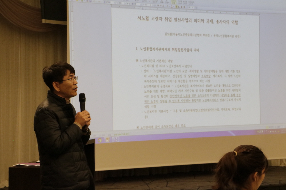 첫 번째 서울시노인종합복지관협회 김익환 부회장의 ‘고령자 취업알선사업의 의미와 과제, 종사자의 역할은 무엇인가?'에 대한 주제로 취업알선 종사자로써의 정체성을 다시금 생각해보는 시간이었습니다.