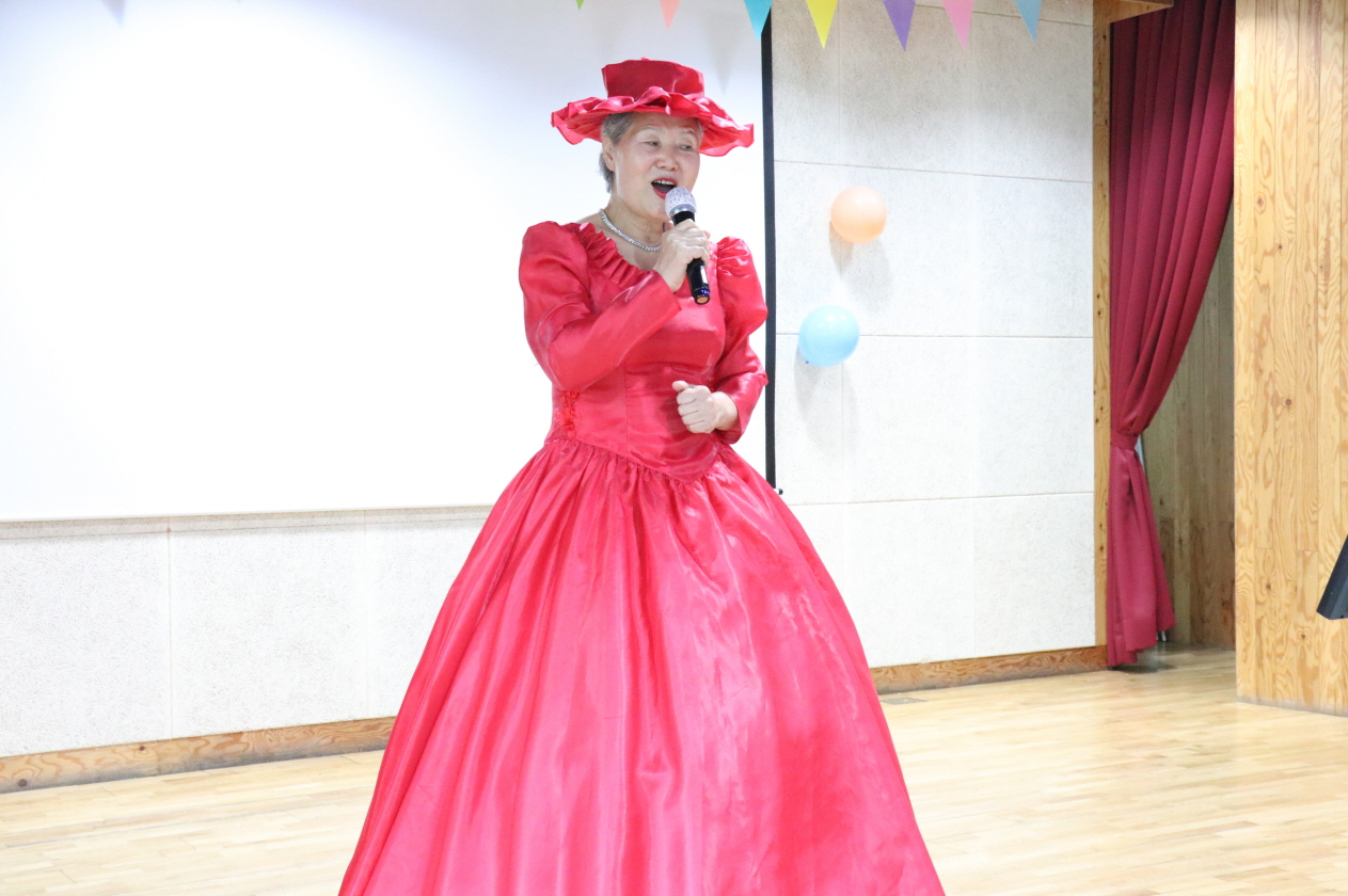 공연 전 수수하게 입고 계신 이진자 어르신께서 갑자기 빨간 드레스를 입고 변신하셨습니다.