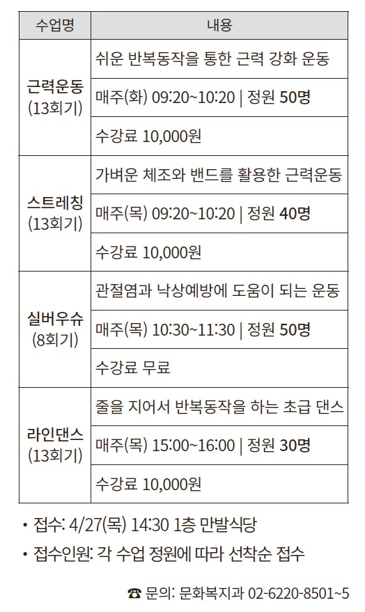 서울노인복지센터에서는 어르신들의 건강한 여가선용을 위하여 건강프로그램을 신규 개설하였습니다. 많은 관심 바랍니다.