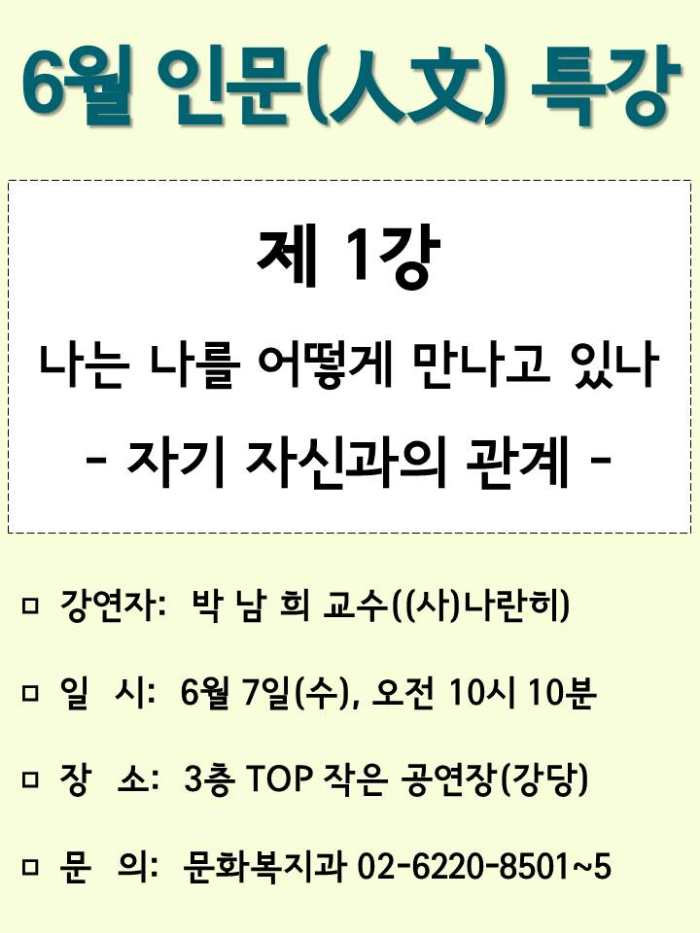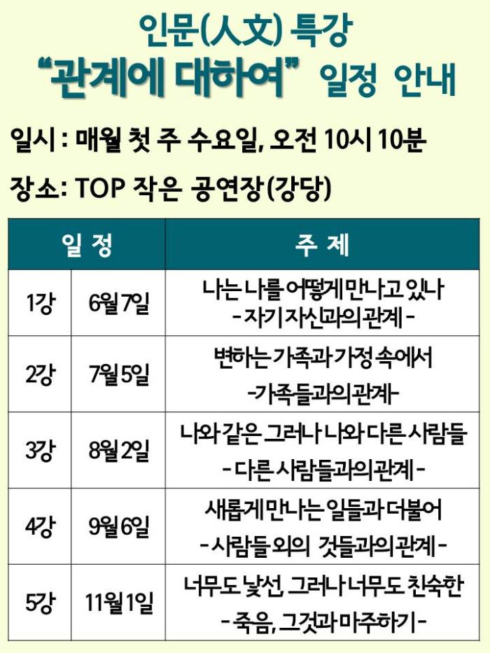 6월부터 매월 첫째주 수요일 마다 진행 될 박남희 교수의 인문특강 "관계에 대하여".