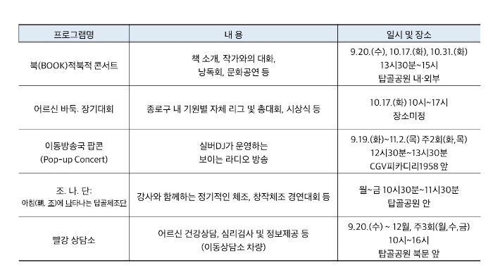 서울노인복지센터는 어르신들이 주도하는 건강하고 활기찬 문화가 어르신 문화의 중심지이자 추억의 장소인 종묘·탑골공원 일대에 확산되도록 함으로써, 세대 간의 교감과 더불어 어르신이 쾌적하고 풍부한 문화생활을 즐길 수 있도록 '종로통 어르신 문화거리' 사업을 시작합니다.