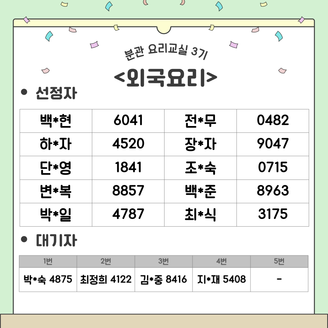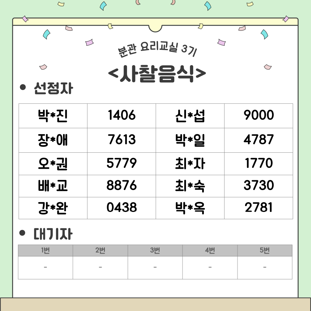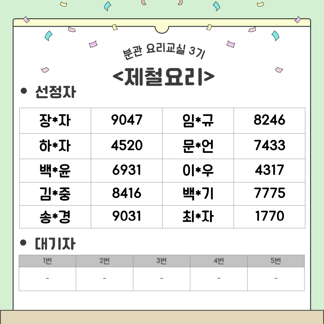 [교육여가문화팀] [분관] 요리교실 3기 선정자 안내