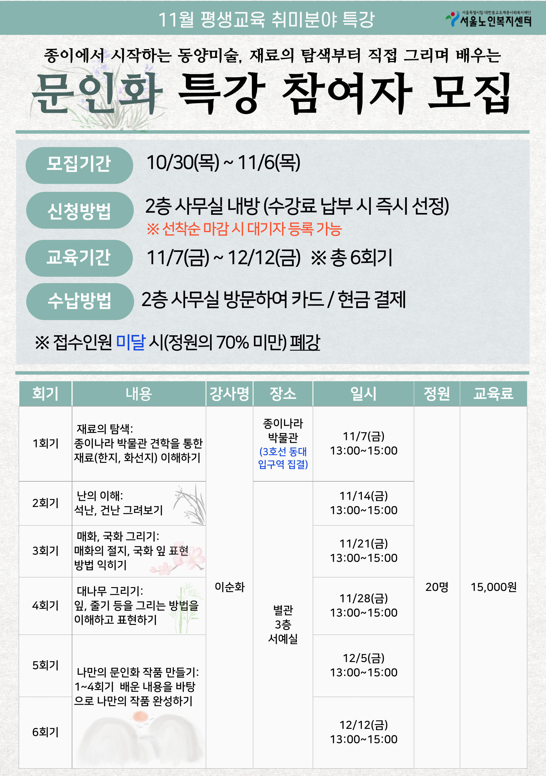 [평생교육팀] 11월 평생교육 취미분야 '문인화' 특강 참여자 모집